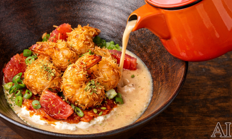 Lake Monster: Knafeh – battered shrimps, fried and set atop a velvety bed of cream cheese and home-made Tunisian harissa, gently pooled with a table-side pour of house-made shrimp bisque. Finished with charred grapefruit segments, green onions, and a dusting of pistachio.